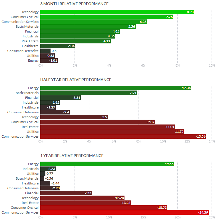 1일/한 달/3달/반년 섹터별 등락률을 통해서, 시장 상황을 가늠해볼 수 있습니다.