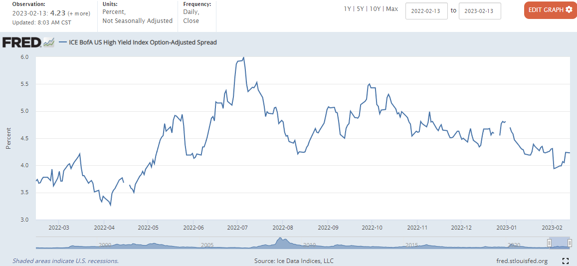 하이일드 채권 스프레드 : 하이일드 채권 수익률 에서 국채 수익률을 뺀 값으로, 이 값이 상승하면 시장이 위험하다는 신호로 볼 수 있습니다. 4% 이하로 하락해야 시장이 안정적인 것으로 판단합니다.