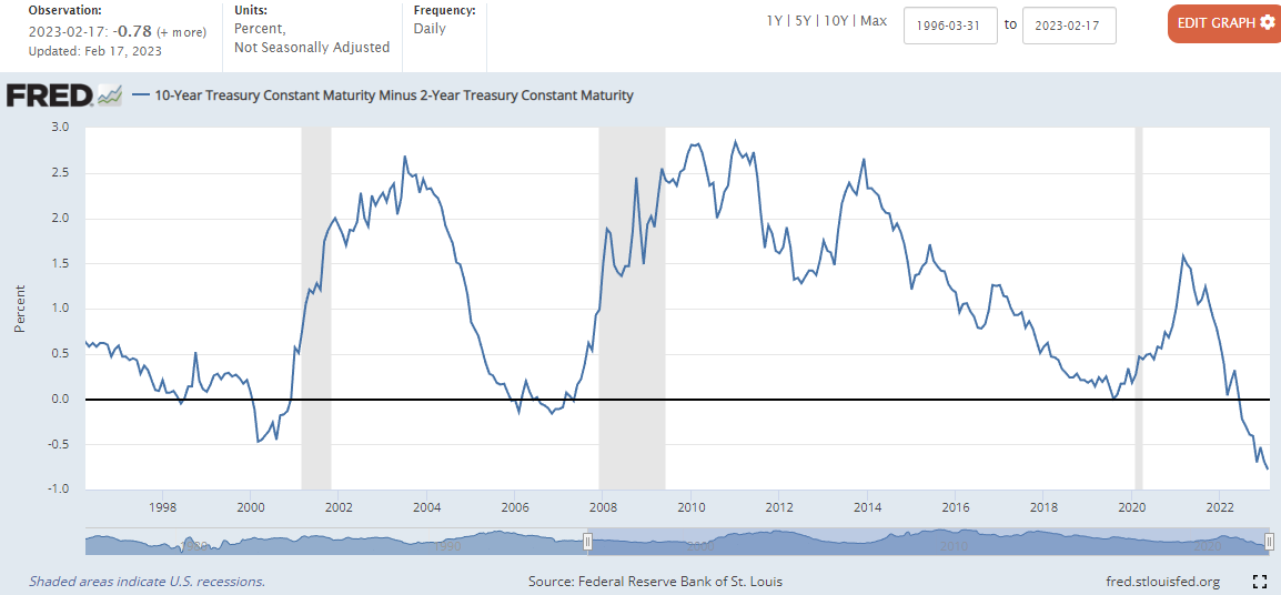 22년 4월 1일 미국 장단기 금리차 역전 항상 미국 10년 물 국채 수익률과 2년 물 국채 수익률의 차이가 마이너스에 도달하면, 1~3년 이내에 경기침체가 일어났었습니다. (위 그래프는 10년 물과 2년
