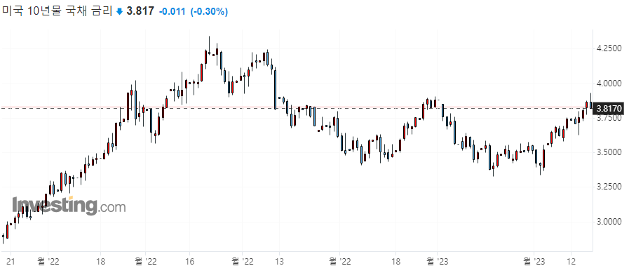 미국 10년물 국채 금리가 최고점을 찍었던 때는 22년 10월인데요. 그 당시 4.338을 찍은 이후 계속 하락추세를 그려왔습니다. 최근 미국의 최종 금리가 5.5%에 도달할 수 있다는 우려가 나오면서 장기채인 10년물 국채 금리도 상승하는 모습을 보이고있는데요.