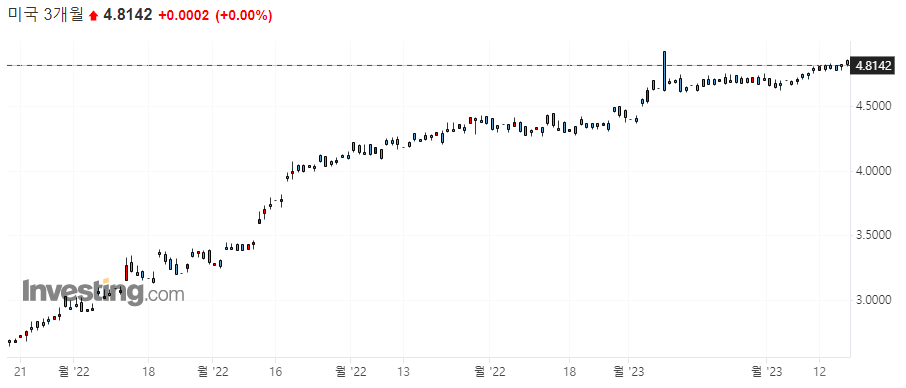 10년물 국채 수익률 3.817 / 2년물 국채 수익률 4.6169 / 3개월물 국채 수익률 4.8142