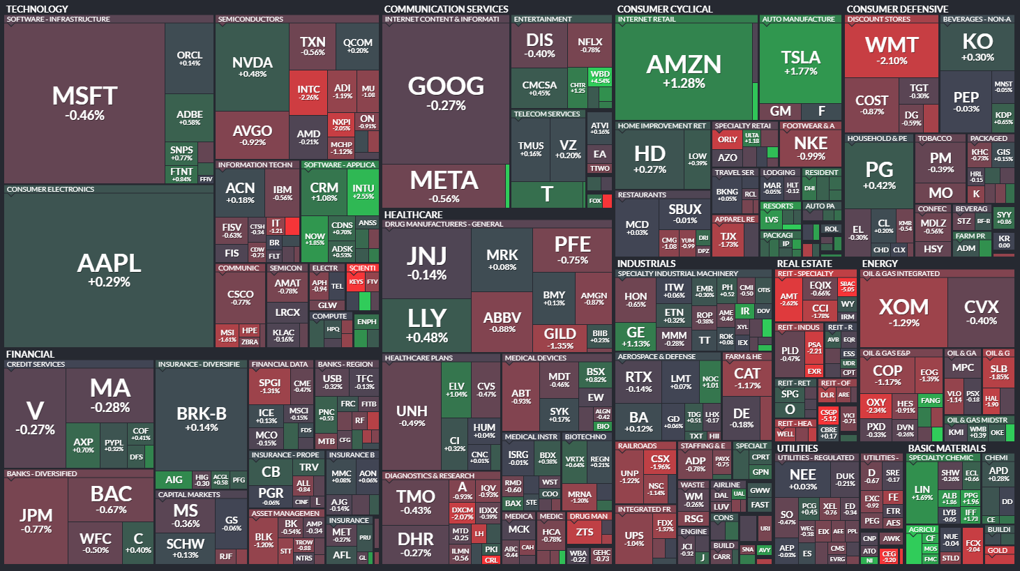 미국 S&P500에 속한 기업들의 주가 등락을 살펴봅니다. 같은 섹터 내에서도 개별 기업 이슈로 인해 주가가 서로 다르게 움직이는 것을 볼 수 있습니다. 특히 섹터 내 대장주, 주도주의 움직임을 통해 해당 섹터의 성장성을 가늠해 보기 좋습니다.