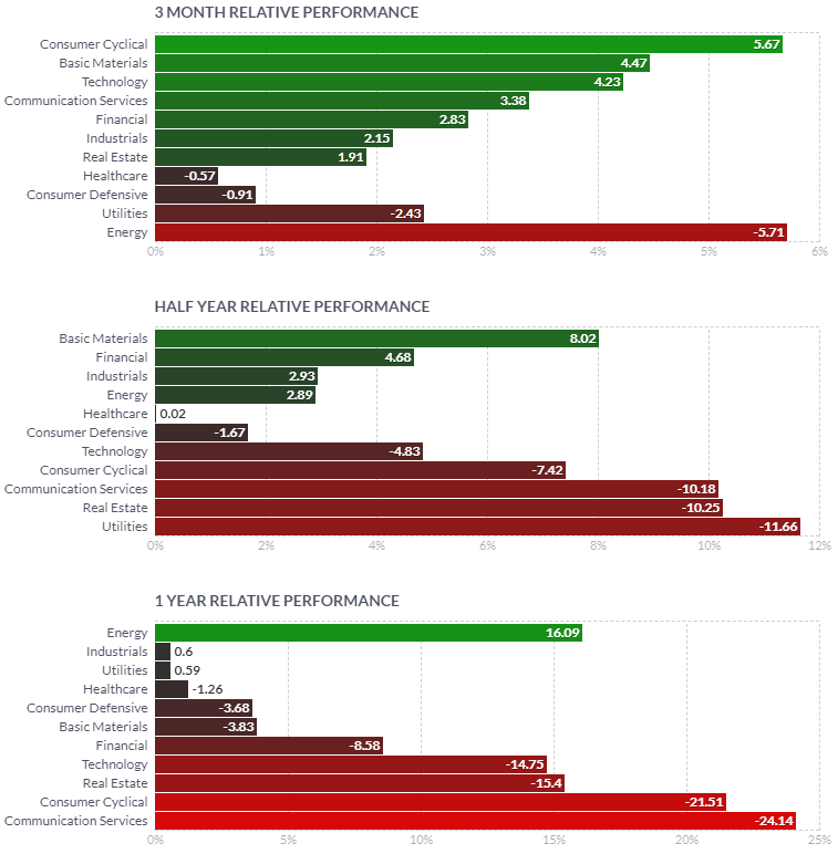 1일/한 달/3달/반년 섹터별 등락률을 통해서, 시장 상황을 가늠해볼 수 있습니다.