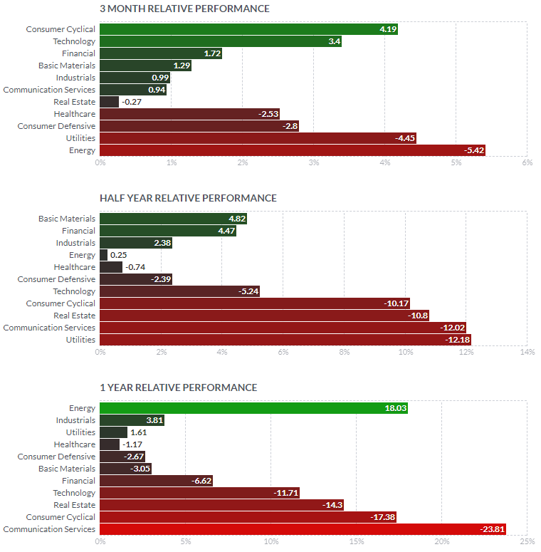 1일/한 달/3달/반년 섹터별 등락률을 통해서, 시장 상황을 가늠해볼 수 있습니다.