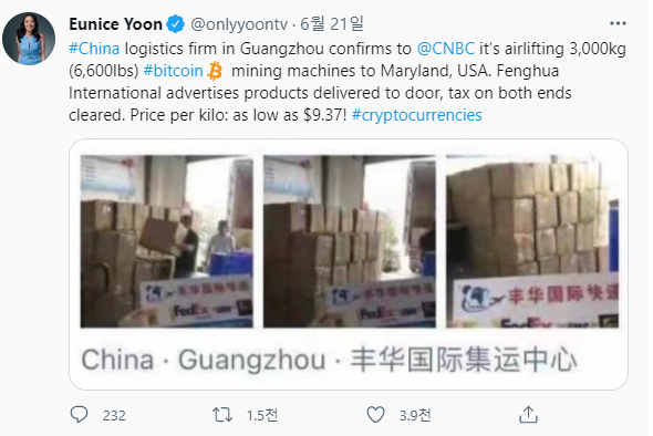 대기업 미디어 CNBC의 북경 지국장을 맡는 Eunice Yoon씨가 사진 첨부로 보고.CNBC는 광저우의 물류기업에 공수 사실을 확인 중인 것으로 알려졌다.최근에는 중국의 단속 강화를 우려해 현지 마이너는 채굴 거점을 이전할 것이라는 전망이 나오고 있지만 이번 공수의 목적은 알려지지 않았다.