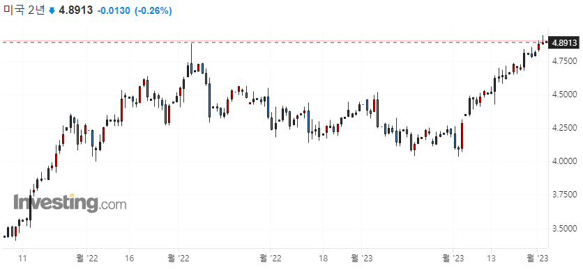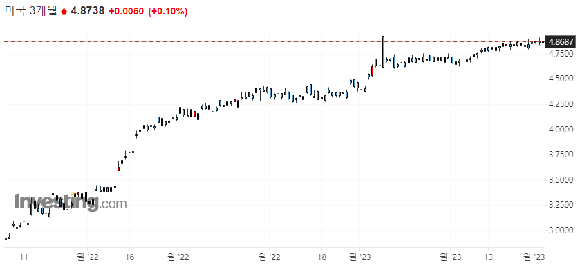 10년물 국채 수익률 4.0620 / 2년물 국채 수익률 4.8892 / 3개월물 국채 수익률 4.8690