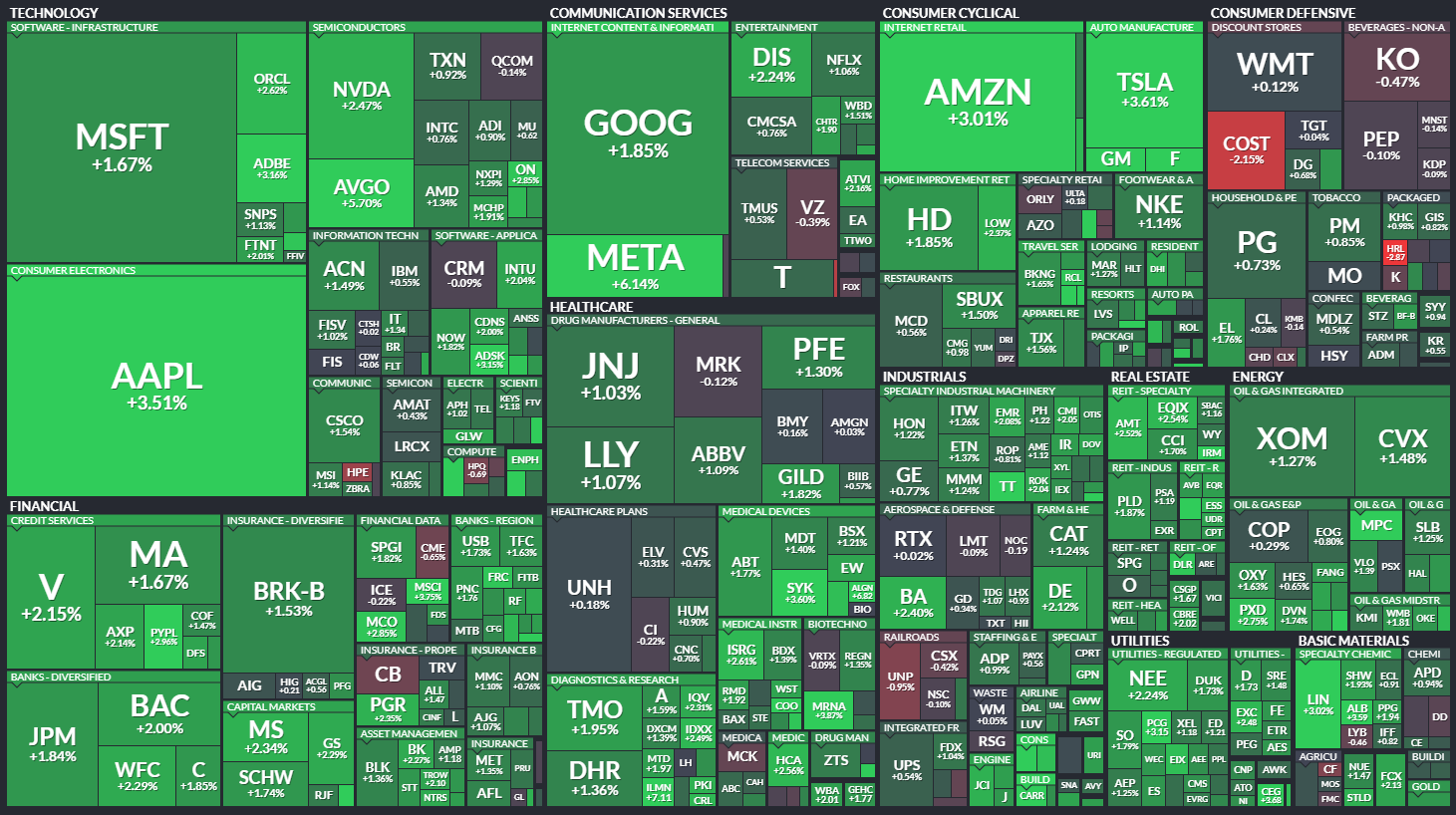 미국 S&P500에 속한 기업들의 주가 등락을 살펴봅니다. 같은 섹터 내에서도 개별 기업 이슈로 인해 주가가 서로 다르게 움직이는 것을 볼 수 있습니다. 특히 섹터 내 대장주, 주도주의 움직임을 통해 해당 섹터의 성장성을 가늠해 보기 좋습니다.