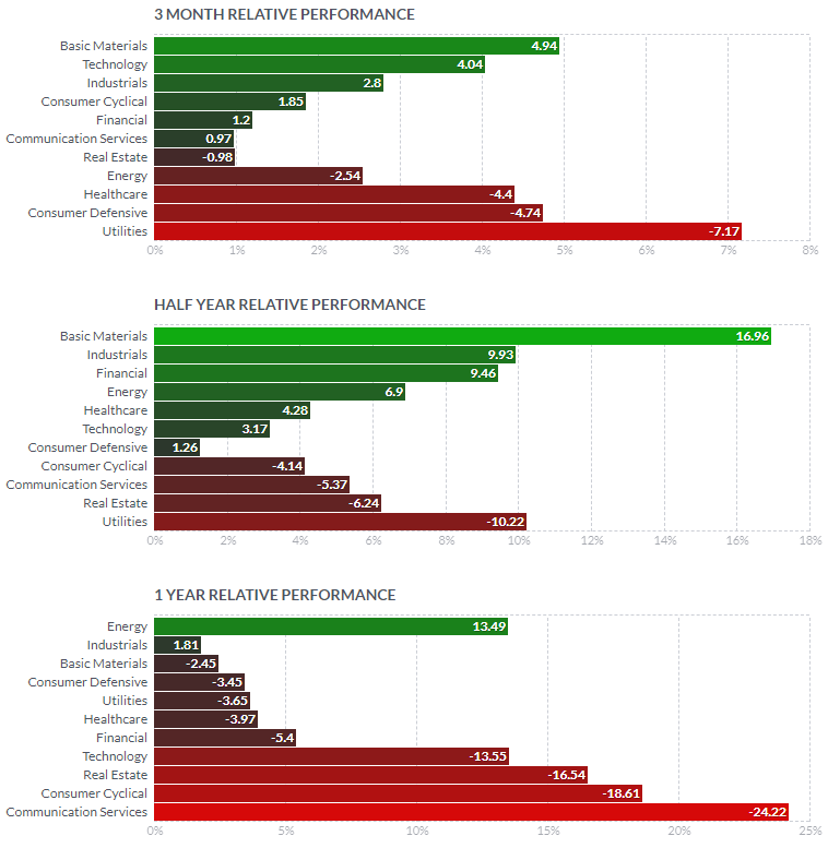 1일/한 달/3달/반년 섹터별 등락률을 통해서, 시장 상황을 가늠해볼 수 있습니다.