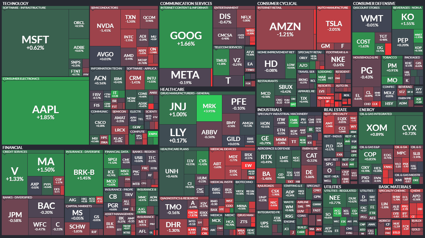 미국 S&P500에 속한 기업들의 주가 등락을 살펴봅니다. 같은 섹터 내에서도 개별 기업 이슈로 인해 주가가 서로 다르게 움직이는 것을 볼 수 있습니다. 특히 섹터 내 대장주, 주도주의 움직임을 통해 해당 섹터의 성장성을 가늠해 보기 좋습니다.