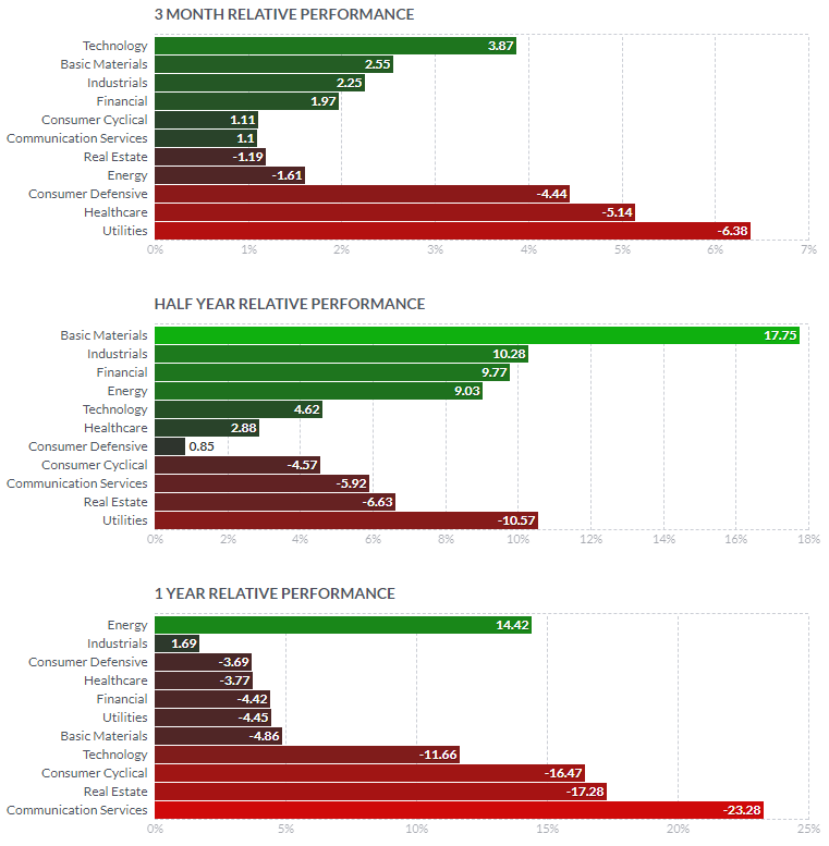 1일/한 달/3달/반년 섹터별 등락률을 통해서, 시장 상황을 가늠해볼 수 있습니다.