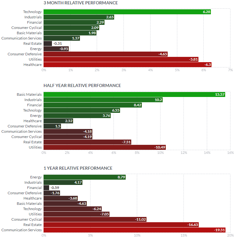 1일/한 달/3달/반년 섹터별 등락률을 통해서, 시장 상황을 가늠해볼 수 있습니다.