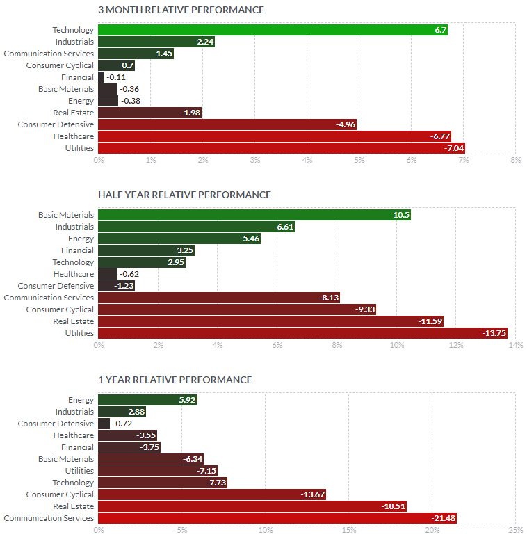 1일/한 달/3달/반년 섹터별 등락률을 통해서, 시장 상황을 가늠해볼 수 있습니다.