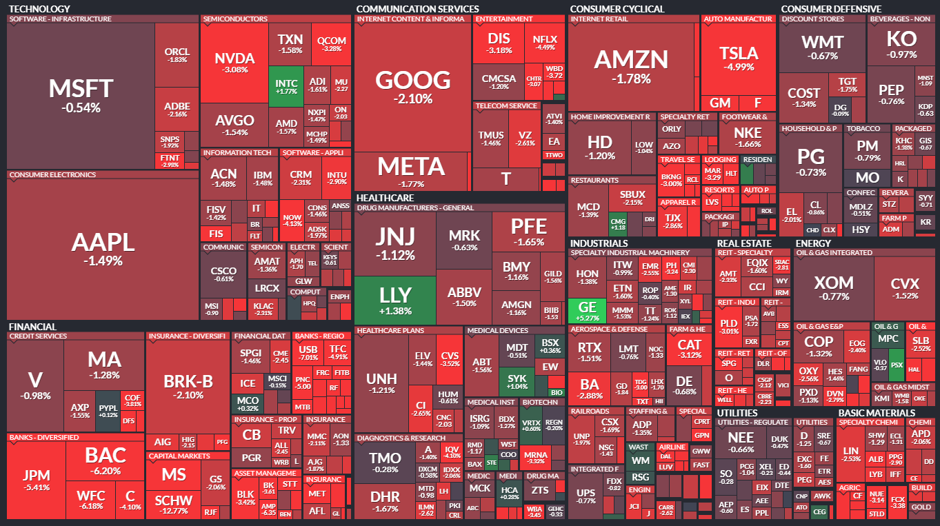 미국 S&P500에 속한 기업들의 주가 등락을 살펴봅니다. 같은 섹터 내에서도 개별 기업 이슈로 인해 주가가 서로 다르게 움직이는 것을 볼 수 있습니다. 특히 섹터 내 대장주, 주도주의 움직임을 통해 해당 섹터의 성장성을 가늠해 보기 좋습니다.