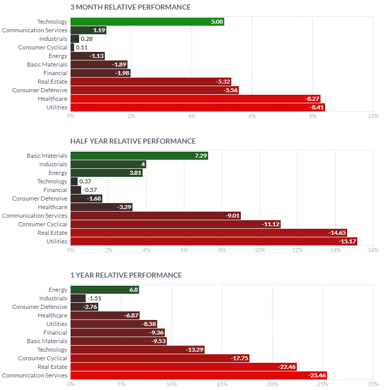 1일/한 달/3달/반년 섹터별 등락률을 통해서, 시장 상황을 가늠해볼 수 있습니다.
