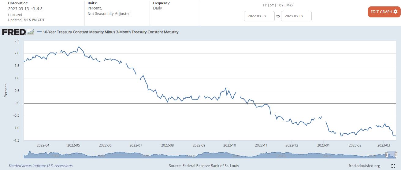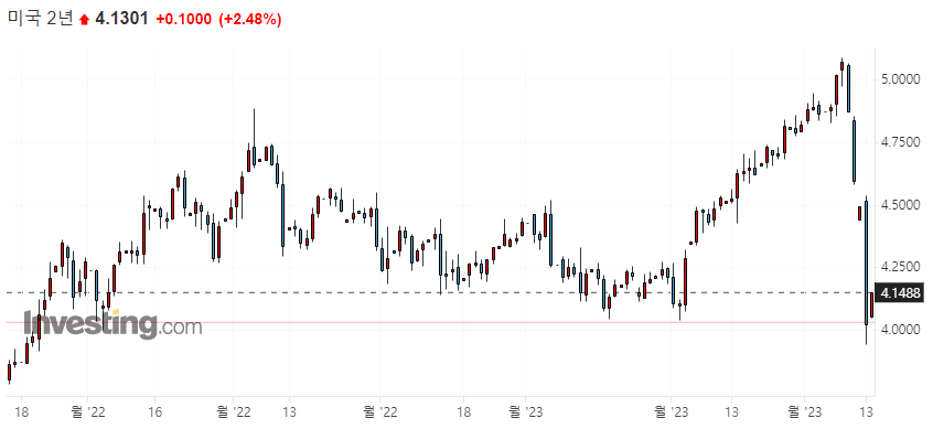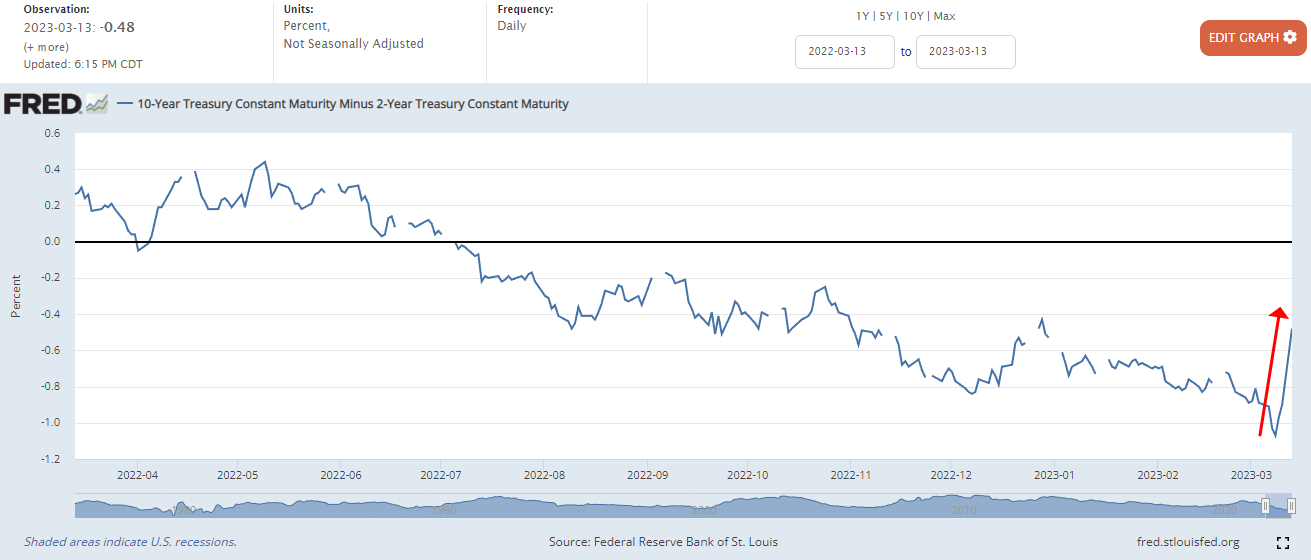 10년물과 2년물의 장단기 금리차 역전현상이 -0.9에서 -0.48로 하루만에 0.42가 상승하는 모습이 나타났습니다. 이러한 단기채 금리 급락은 최근 발생한 실리콘 밸리 뱅크와 시그니처 뱅크의 파산으로 인해 더 이상 기준 금리를 올린다면, 미국 중소형 은행에 시스템 위기가 올 수 있다는 주장이 힘을 얻으면서 나타났습니다.