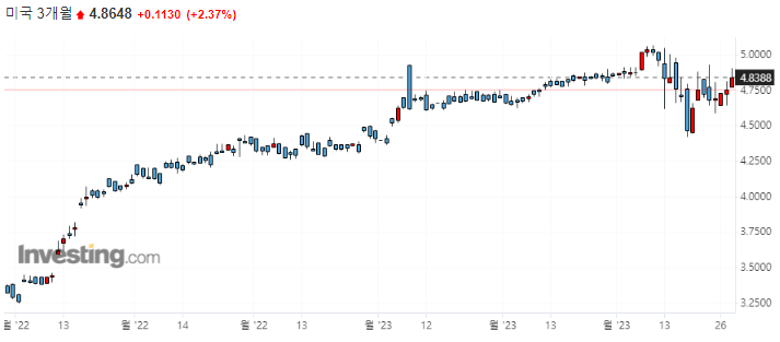 초 단기 금리(3개월 물) : 단기적인 자금 유통과 관련됩니다. 급등은 단기적 시장 위험을 의미