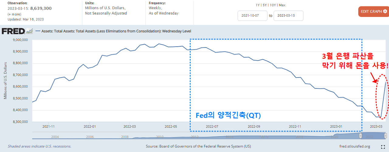 만약 여기서 유동성을 더 푼다면, 달러 가치 급락이 미국 경제에 인플레이션을 더 크게 자극할 수 있습니다. 반대로 기준 금리 인상과 QT는 현재 취약해진 은행들과 상업용 부동산 시장을 더 취약하게 만들 수 있죠. 확실히 미국 경제가 거의 버틸 수 있는 한계점까지 도달한 것이 아닌가 하는 생각이 듭니다.
