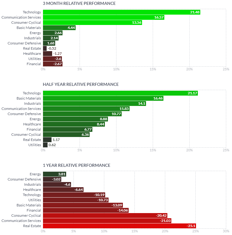 1일/한 달/3달/반년 섹터별 등락률을 통해서, 시장 상황을 가늠해볼 수 있습니다.