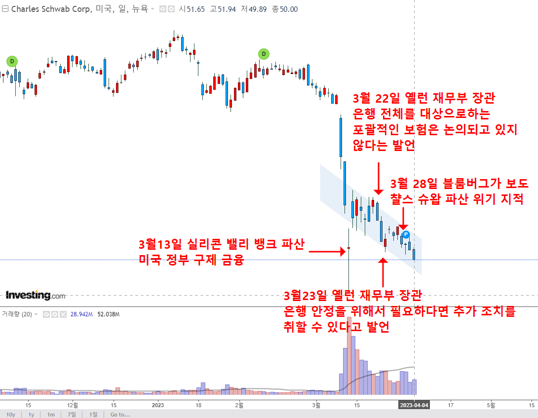 만약 챨스 슈왑(SCHW)이 파산한다면, 옐런 재무부 장관이 3월 23일에 의회에서 발언했던 것 처럼, 쉽게 예금자 보호를 말하며, 시장을 안심시키는 것은 불가능하게 됩니다.