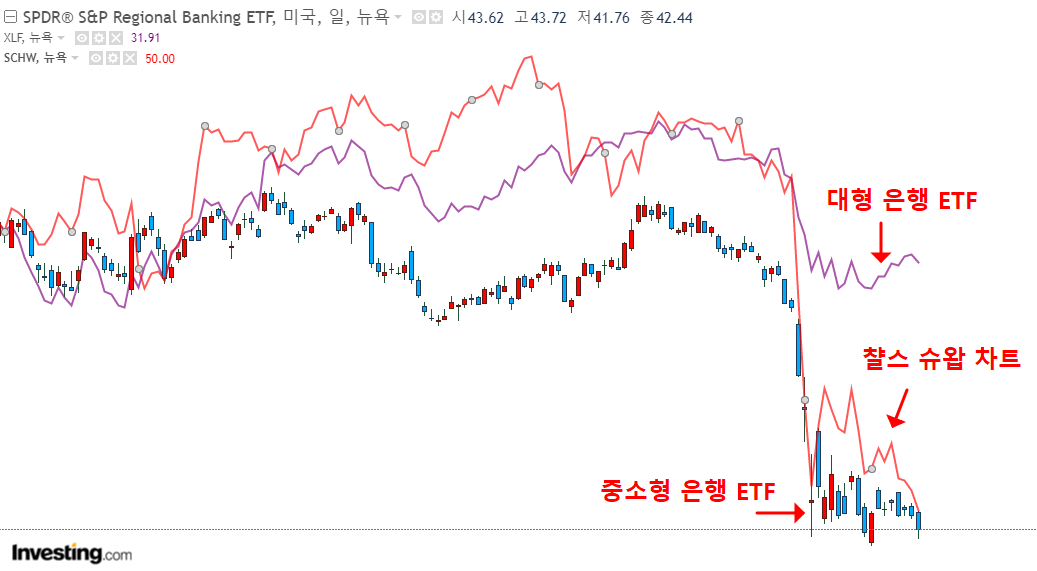 오히려 예금이 중소은행에서 대형은행으로 흘러들어오면서 대형은행이 주가를 회복하고있는 것과는 다르게 챨스 슈왑(SCHW)은 여전히 최저점을 향해 하락하고있는 것 입니다.