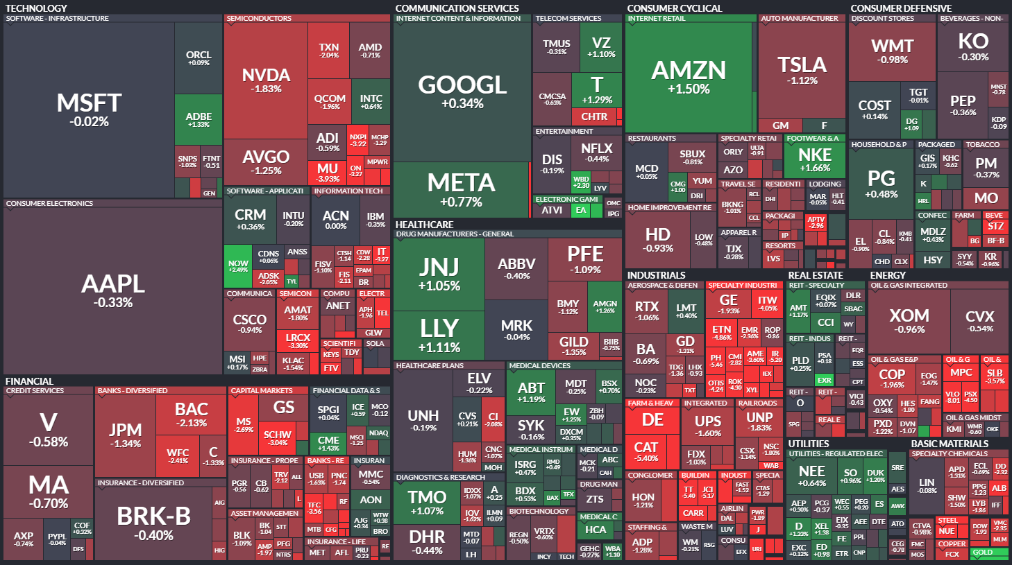 미국 S&P500에 속한 기업들의 주가 등락을 살펴봅니다. 같은 섹터 내에서도 개별 기업 이슈로 인해 주가가 서로 다르게 움직이는 것을 볼 수 있습니다. 특히 섹터 내 대장주, 주도주의 움직임을 통해 해당 섹터의 성장성을 가늠해 보기 좋습니다.