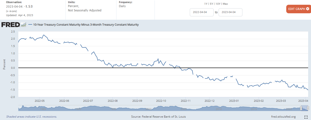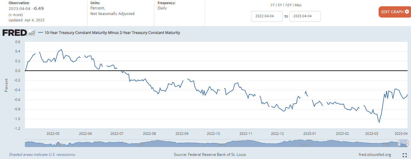 22년 4월 1일 미국 장단기 금리차 역전 항상 미국 10년 물 국채 수익률과 2년 물 국채 수익률의 차이가 마이너스에 도달하면, 1~3년 이내에 경기침체가 일어났었습니다. (위 그래프는 10년 물과 2년