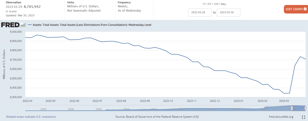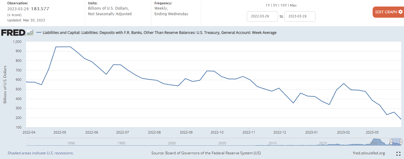 Treasury General Account(TGA) : 미국 재무부에서 세금이나 국채를 발행함으로써 확보한 자금을 보관하는 계좌에서 자금의 변동을 차트로 표시합니다. 국채를 많이 발행하여 팔게 되면 차트가 상승하고, 재정지출이 발생하면 차트가 하락합니다. 이러한 미 재무부의 계좌는 의회에서 정한 부채한도가 정해져 있기 때문에 국채를 마구 발행할 수 있는 것은 아닙니다. 23년 4월 3일 현재 미국의 부채한도가 상한선에 도달하였으므로, 양적완화를 하는 경우가 아니라면 차트의 상승은 유동성의 흡수로 인한 것으로 볼 수 있습니다.