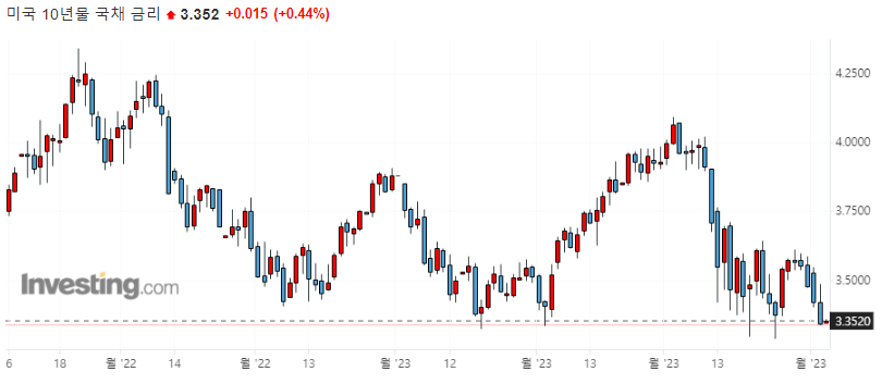 국채 금리 = 국채 수익률은 채권 가격과 반비례합니다. 예를 들어 채권 가격이 하락한다는 것은 국채 수익률이 상승한다는 의미입니다. 일반적으로 [경기 침체 우려]→[안전 자산인 채권 수요 증가]→[채권 수익률(국채 금리) 하락]입니다.