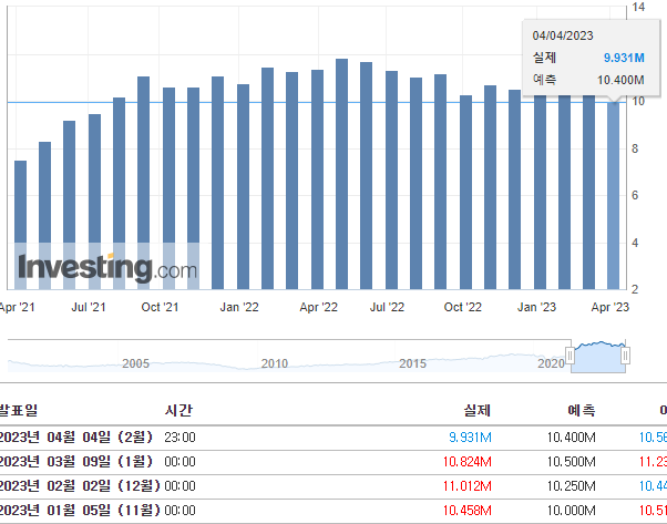 이렇게 노동 시장이 약하든 강하든 상관없이 상승만 하던 나스닥이 이상 신호를 보낸 것은 정확히 한국 시간으로 4월 4일(화) 11시에 미국 노동부 JOLTs보고서가 예상치를 하회하면서부터입니다.