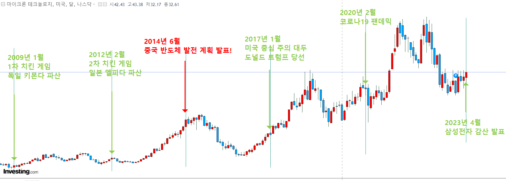 위 차트를 보면 신기하게도 반도체 치킨 게임의 승자와 패자가 확실시되었을 때, 주가는 오르는 것을 알 수 있습니다. 2009년 1차 치킨 게임이 그랬으며, 2012년 2차 치킨 게임 또한 승자와 패자가 나누리 고난 후, 나머지 승자들의 독주가 시작되게 됩니다.