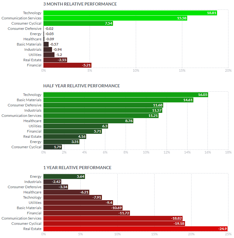 1일/한 달/3달/반년 섹터별 등락률을 통해서, 시장 상황을 가늠해볼 수 있습니다.