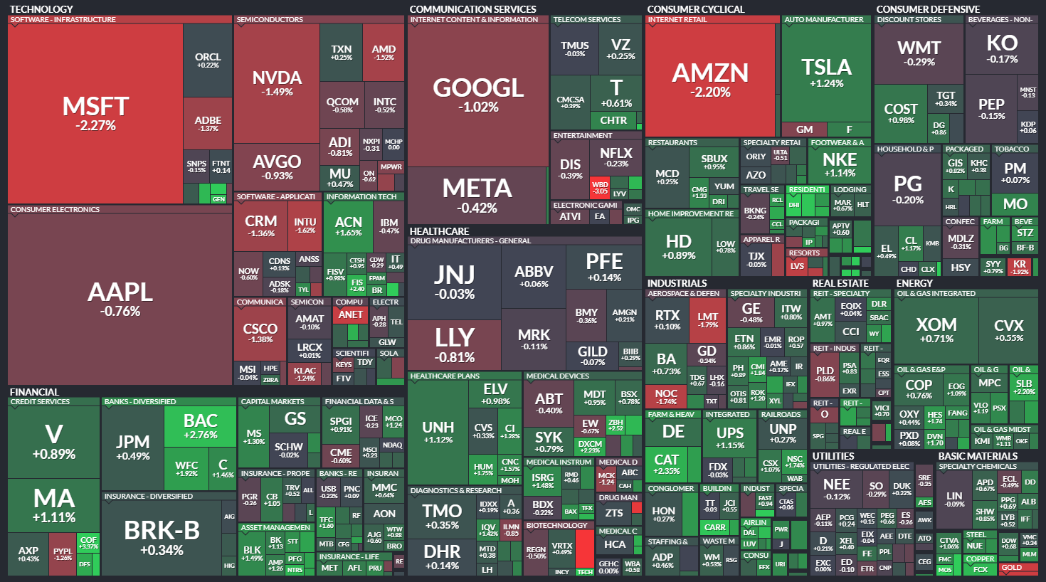 미국 S&P500에 속한 기업들의 주가 등락을 살펴봅니다. 같은 섹터 내에서도 개별 기업 이슈로 인해 주가가 서로 다르게 움직이는 것을 볼 수 있습니다. 특히 섹터 내 대장주, 주도주의 움직임을 통해 해당 섹터의 성장성을 가늠해 보기 좋습니다.