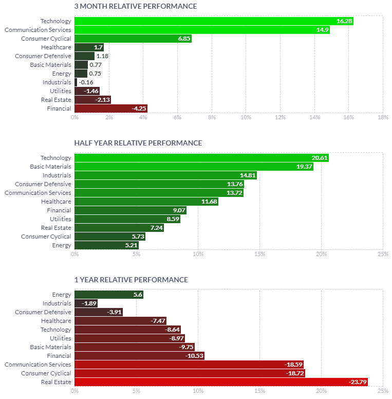 1일/한 달/3달/반년 섹터별 등락률을 통해서, 시장 상황을 가늠해볼 수 있습니다.