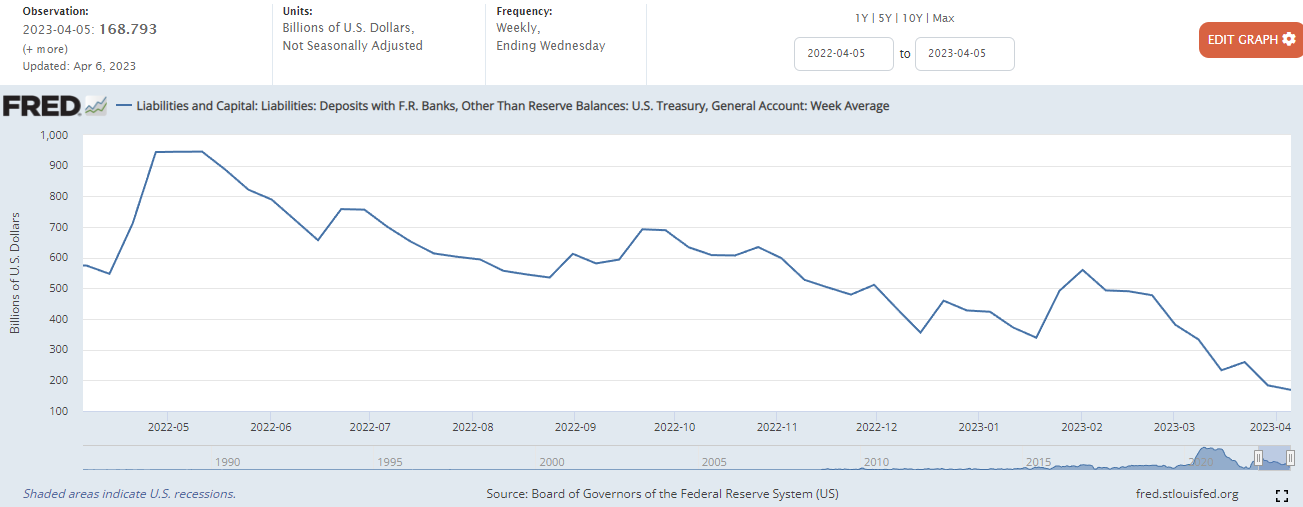 이러한 미 재무부의 계좌는 의회에서 정한 부채한도가 정해져 있기 때문에 국채를 마구 발행할 수 있는 것은 아닙니다. 따라서 현재 부채한도 협상이 합의되지 않은 시점에서 재무부의 계좌가 바닥을 보이고 있다는 것은 그리 반가운 소식이 아닙니다.
