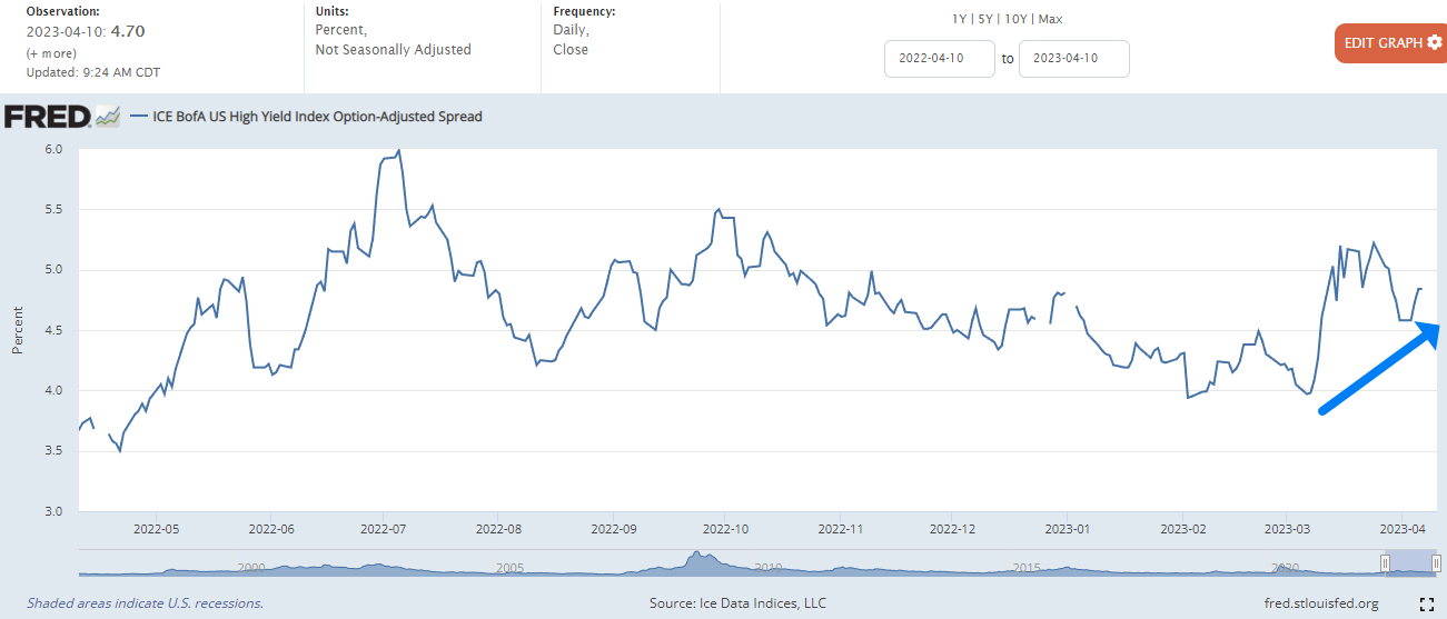 상업 은행의 대출 감소가 중소 기업들에게 영향을 미치고 있다는 근거는 하이일드 스프레드를 통해서도 확인이 가능한데요. 하이일드 채권들의 경우 중소 기업들이 자금을 융통하기 위한 하나의 창구로 볼 수 있는데 그 채권 이자가 급히 증가하고 있습니다.