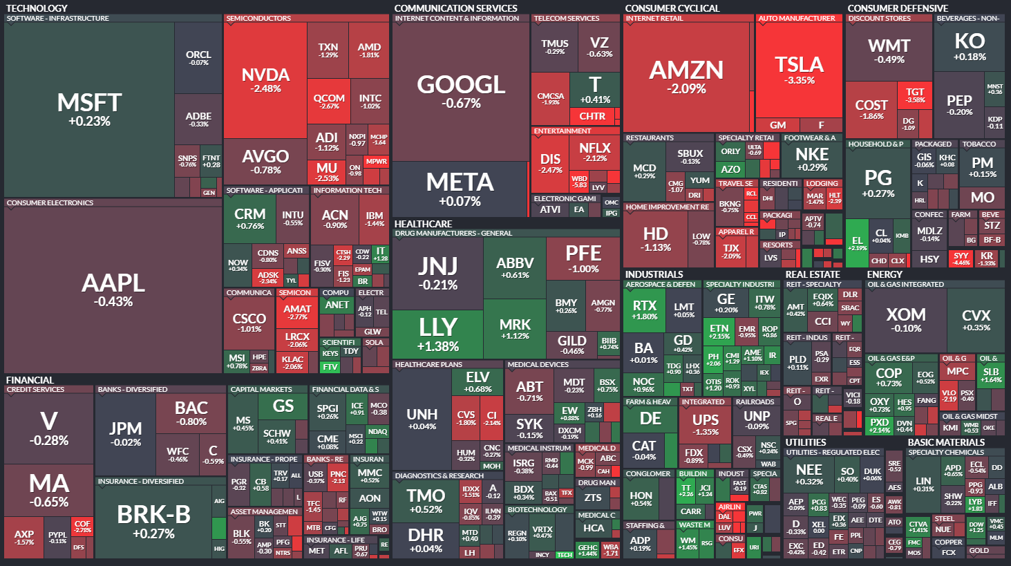 미국 S&P500에 속한 기업들의 주가 등락을 살펴봅니다. 같은 섹터 내에서도 개별 기업 이슈로 인해 주가가 서로 다르게 움직이는 것을 볼 수 있습니다. 특히 섹터 내 대장주, 주도주의 움직임을 통해 해당 섹터의 성장성을 가늠해 보기 좋습니다.