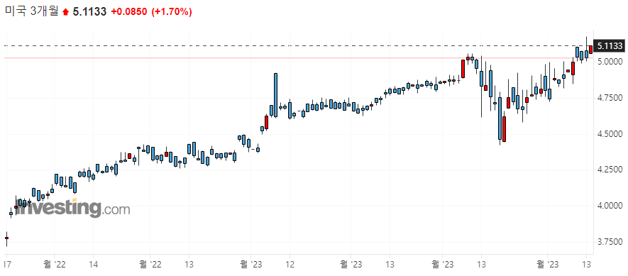 → 4월 13일) 미국 3개월물 국채 금리 고점 돌파 신고가!