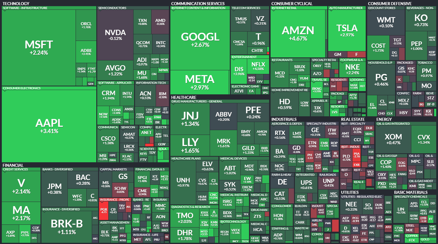 미국 S&P500에 속한 기업들의 주가 등락을 살펴봅니다. 같은 섹터 내에서도 개별 기업 이슈로 인해 주가가 서로 다르게 움직이는 것을 볼 수 있습니다. 특히 섹터 내 대장주, 주도주의 움직임을 통해 해당 섹터의 성장성을 가늠해 보기 좋습니다.