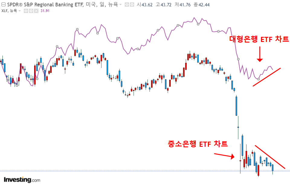 JP모건, 웰스파고, 시티그룹 등 4월 14일 좋은 실적을 발표하면서, 대형 은행들의 주가가 크게 상승하였습니다. 대형 은행들의 주가 상승은 그 동안 은행 위기로 불안해하던 시장에 큰 상승 동력이되었는데요. 반면 중소은행의 경우, 실적이 기대치를 하회하면서 주가가 하락하는 모습이 나타났습니다.