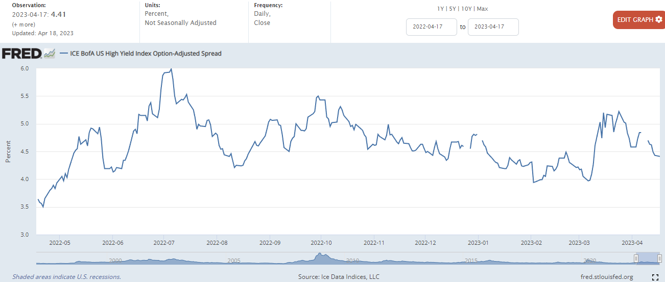 하이일드 채권 스프레드 : 하이일드 채권 수익률에서 국채 수익률을 뺀 값으로, 이 값이 상승하면 시장이 위험하다는 신호로 볼 수 있습니다. 4% 이하로 하락해야 시장이 안정적인 것으로 판단합니다.