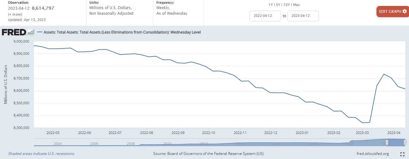 Treasury General Account(TGA) : 미국 재무부에서 세금이나 국채를 발행함으로써 확보한 자금을 보관하는 계좌에서 자금의 변동을 차트로 표시합니다. 국채를 많이 발행하여 팔게 되면 차트가 상승하고, 재정지출이 발생하면 차트가 하락합니다. 이러한 미 재무부의 계좌는 의회에서 정한 부채한도가 정해져 있기 때문에 국채를 마구 발행할 수 있는 것은 아닙니다. 23년 4월 3일 현재 미국의 부채한도가 상한선에 도달하였으므로, 양적완화를 하는 경우가 아니라면 차트의 상승은 유동성의 흡수로 인한 것으로 볼 수 있습니다.