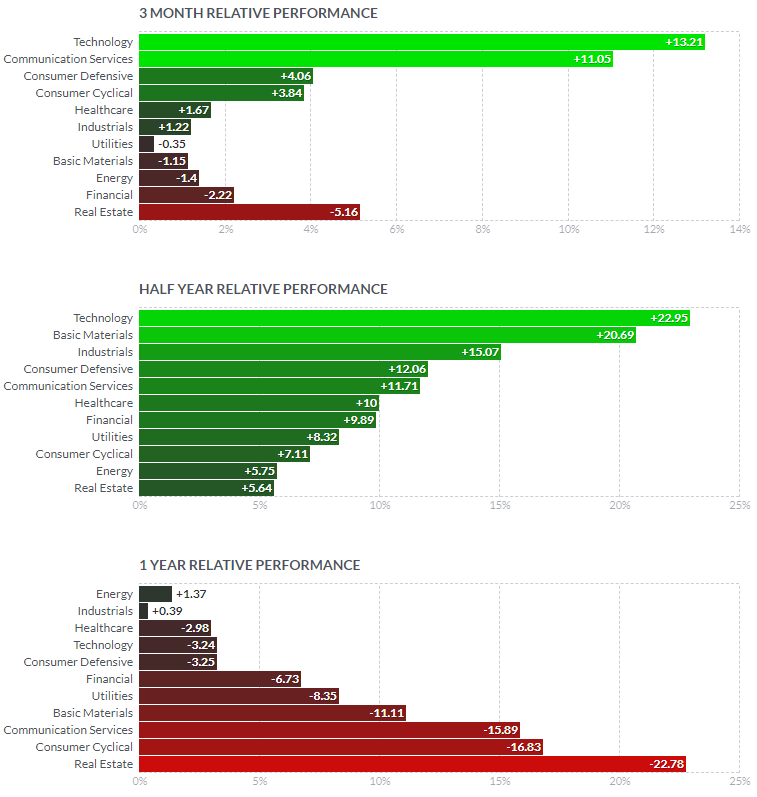 1일/한 달/3달/반년 섹터별 등락률을 통해서, 시장 상황을 가늠해볼 수 있습니다.