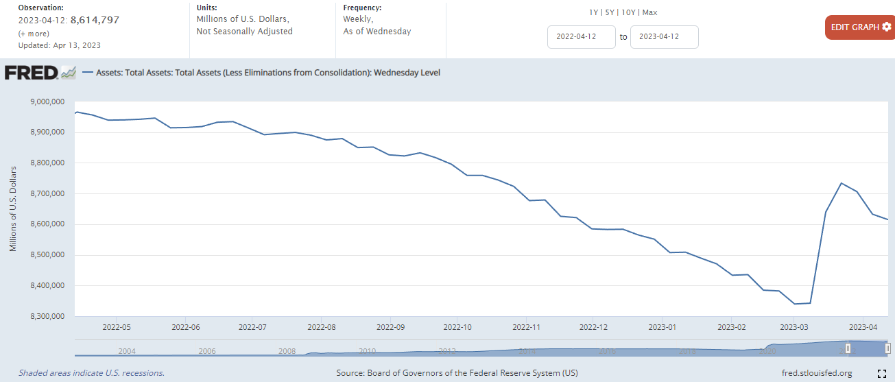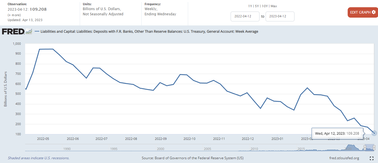 Treasury General Account(TGA) : 미국 재무부에서 세금이나 국채를 발행함으로써 확보한 자금을 보관하는 계좌에서 자금의 변동을 차트로 표시합니다. 국채를 많이 발행하여 팔게 되면 차트가 상승하고, 재정지출이 발생하면 차트가 하락합니다. 이러한 미 재무부의 계좌는 의회에서 정한 부채한도가 정해져 있기 때문에 국채를 마구 발행할 수 있는 것은 아닙니다. 23년 4월 3일 현재 미국의 부채한도가 상한선에 도달하였으므로, 양적완화를 하는 경우가 아니라면 차트의 상승은 유동성의 흡수로 인한 것으로 볼 수 있습니다.