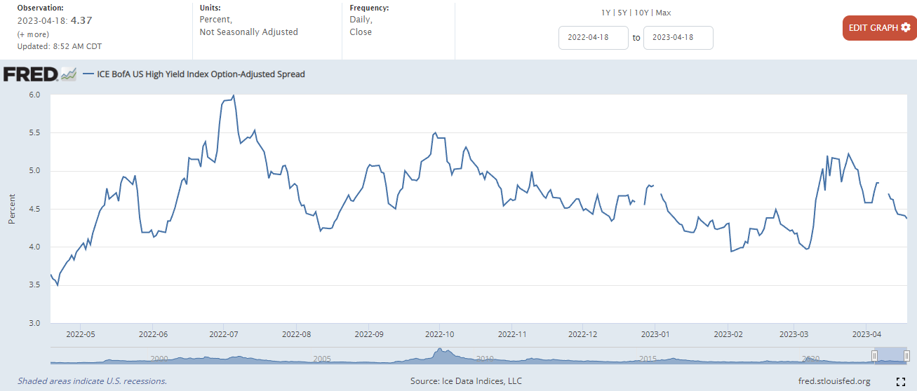 하이일드 채권 스프레드 : 하이일드 채권 수익률에서 국채 수익률을 뺀 값으로, 이 값이 상승하면 시장이 위험하다는 신호로 볼 수 있습니다. 4% 이하로 하락해야 시장이 안정적인 것으로 판단합니다.