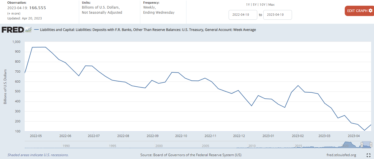 Treasury General Account(TGA) : 미국 재무부에서 세금이나 국채를 발행함으로써 확보한 자금을 보관하는 계좌에서 자금의 변동을 차트로 표시합니다. 국채를 많이 발행하여 팔게 되면 차트가 상승하고, 재정지출이 발생하면 차트가 하락합니다. 이러한 미 재무부의 계좌는 의회에서 정한 부채한도가 정해져 있기 때문에 국채를 마구 발행할 수 있는 것은 아닙니다. 23년 4월 3일 현재 미국의 부채한도가 상한선에 도달하였으므로, 양적완화를 하는 경우가 아니라면 차트의 상승은 유동성의 흡수로 인한 것으로 볼 수 있습니다.