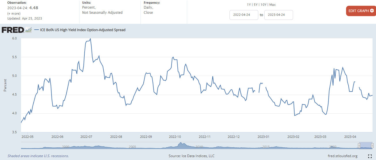 하이일드 채권 스프레드 : 하이일드 채권 수익률에서 국채 수익률을 뺀 값으로, 이 값이 상승하면 시장이 위험하다는 신호로 볼 수 있습니다. 4% 이하로 하락해야 시장이 안정적인 것으로 판단합니다.
