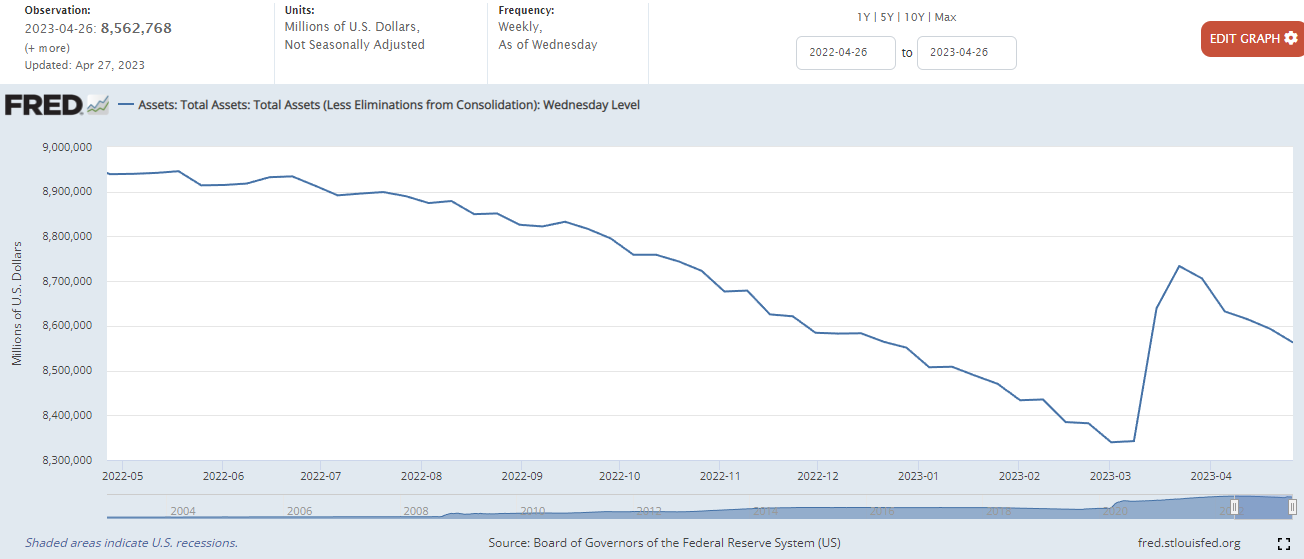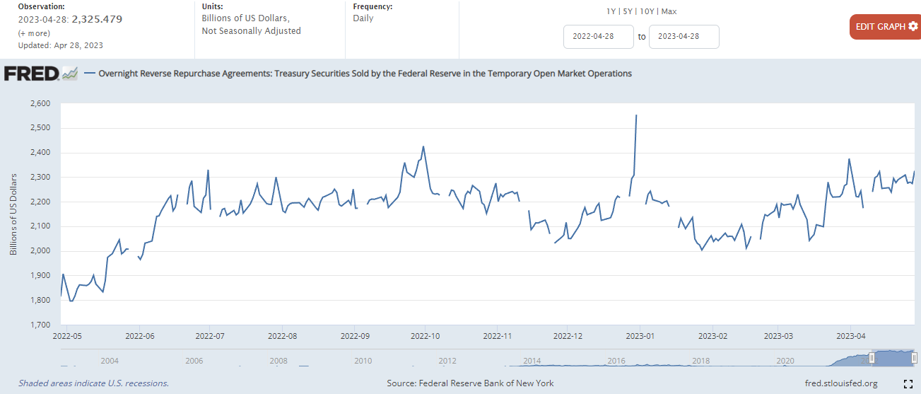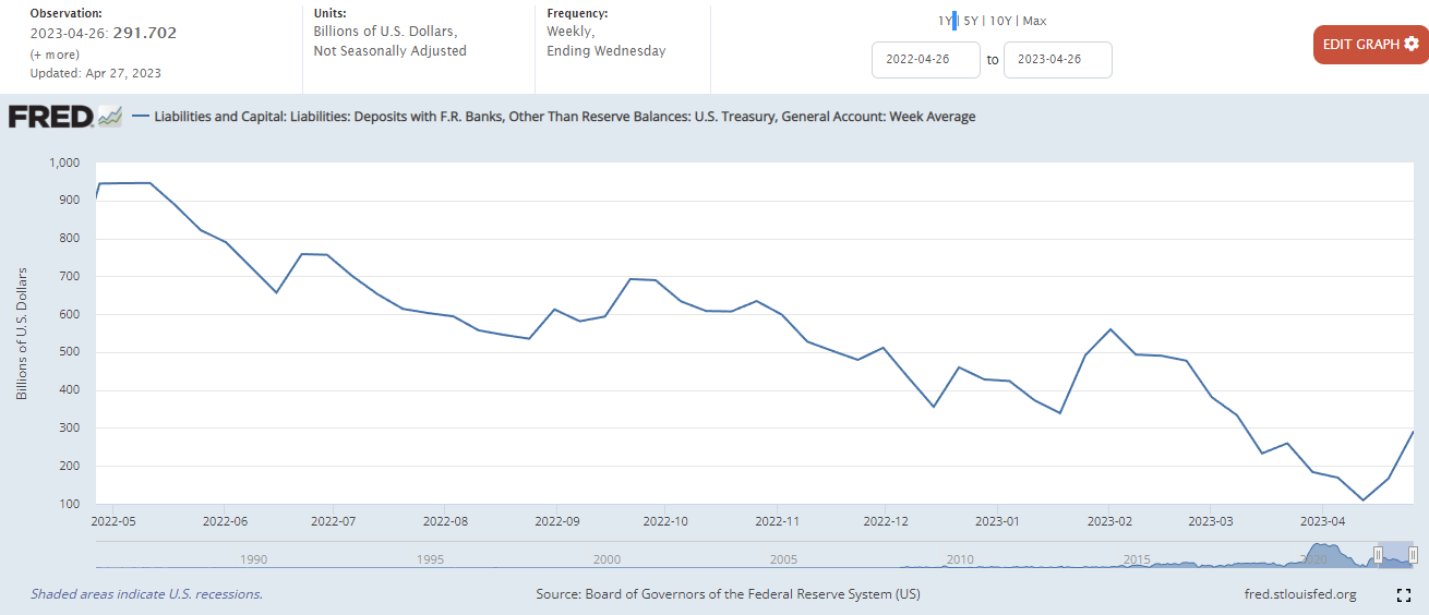 Treasury General Account(TGA) : 미국 재무부에서 세금이나 국채를 발행함으로써 확보한 자금을 보관하는 계좌에서 자금의 변동을 차트로 표시합니다. 국채를 많이 발행하여 팔게 되면 차트가 상승하고, 재정지출이 발생하면 차트가 하락합니다. 이러한 미 재무부의 계좌는 의회에서 정한 부채한도가 정해져 있기 때문에 국채를 마구 발행할 수 있는 것은 아닙니다. 23년 4월 3일 현재 미국의 부채한도가 상한선에 도달하였으므로, 양적완화를 하는 경우가 아니라면 차트의 상승은 유동성의 흡수로 인한 것으로 볼 수 있습니다.
