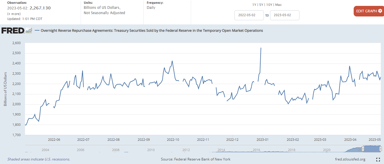 그 근본적인 이유는 미국의 기준 금리가 너무 높기 때문에 발생하는 문제입니다. 기준 금리가 높은 만큼 역레포 금리도 높아지고, 결국 은행 시스템에서 연준의 역레포로 돈이 이동하고 있다는 것이 문제인 것 입니다.