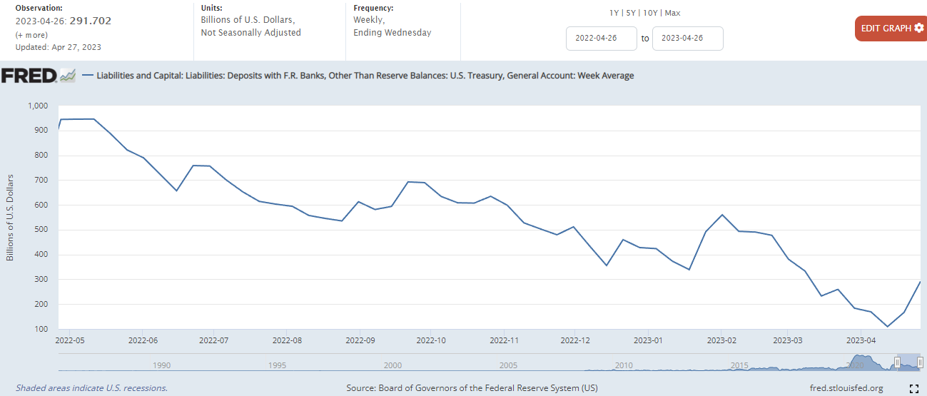 Treasury General Account(TGA) : 미국 재무부에서 세금이나 국채를 발행함으로써 확보한 자금을 보관하는 계좌에서 자금의 변동을 차트로 표시합니다. 국채를 많이 발행하여 팔게 되면 차트가 상승하고, 재정지출이 발생하면 차트가 하락합니다. 이러한 미 재무부의 계좌는 의회에서 정한 부채한도가 정해져 있기 때문에 국채를 마구 발행할 수 있는 것은 아닙니다. 23년 4월 3일 현재 미국의 부채한도가 상한선에 도달하였으므로, 양적완화를 하는 경우가 아니라면 차트의 상승은 유동성의 흡수로 인한 것으로 볼 수 있습니다.