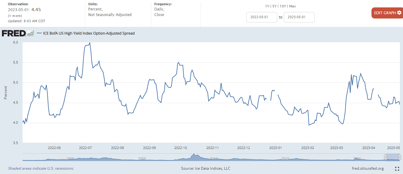 하이일드 채권 스프레드 : 하이일드 채권 수익률에서 국채 수익률을 뺀 값으로, 이 값이 상승하면 시장이 위험하다는 신호로 볼 수 있습니다. 4% 이하로 하락해야 시장이 안정적인 것으로 판단합니다.